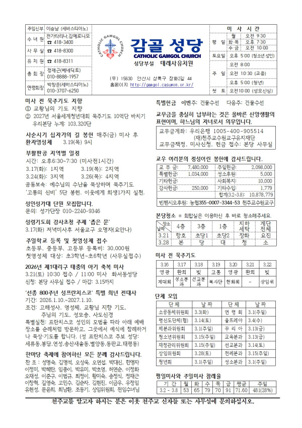 [주보] 사순제4주일 (2026. 3. 15) 페이지 정보 작성자 감골성당 작성일 26-03-15 07:57 본문 [주보] 사순제4주일 (2026. 3. 15) 목록 다음글[주보] 사순제3주일 (2026. 3. 8) 26.03.05